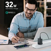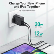 32W Total Output: Equipped with an 20W Power Delivery 3.0 port and a 12W USB port, this charger supports simultaneous charging for two devices