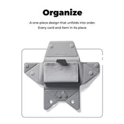 Organise: A one-piece design that unfolds into order. Every card and item in its place.