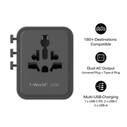 1-World² 35W 5-Port Travel Adaptor - your ultimate companion for hassle-free charging anywhere in the world. Whether you're a frequent flyer or occasional traveler.